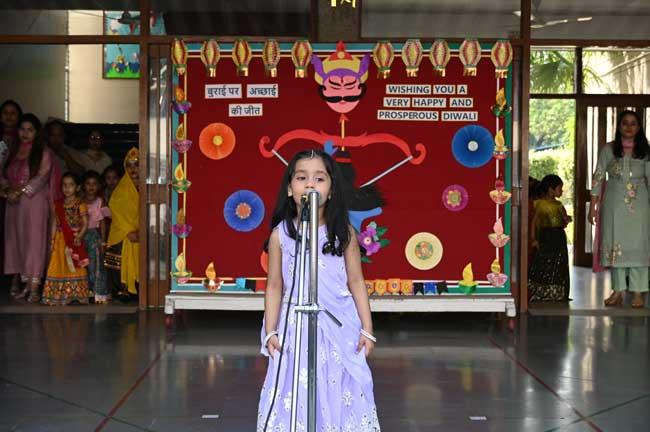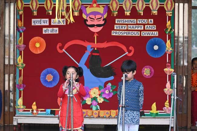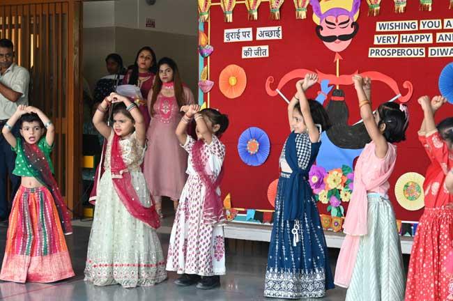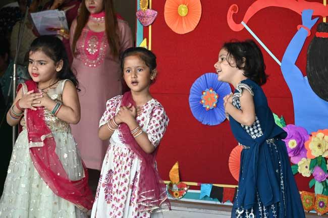 Our nursery kids shone brightly in their Diwali assembly. With sparkling smiles and twinkling costumes, they celebrated the festival of lights with joy and enthusiasm. The tiny tots danced to traditional songs and beautifully depicted the story of Ramayana, bringing the epic tale to life. Their innocent faces lit up the stage, spreading happiness all around, and making the celebration truly unforgettable.